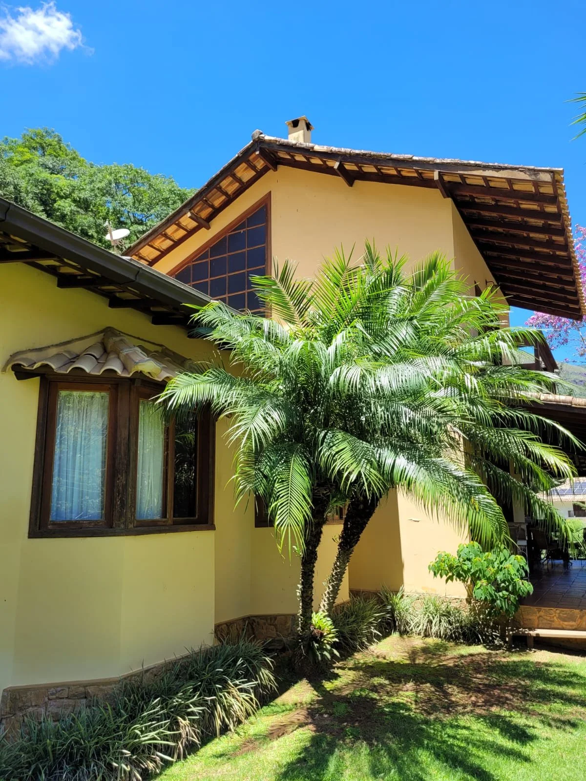 Architecturally, the house follows a Brazilian vernacular language influenced by mountain and countryside residences, with multiple intersecting pitched roofs in ceramic clay tiles that respond to heavy rainfall while extended eaves provide solar protection and reinforce horizontal lines. The façades combine smooth stucco in warm tones with extensive natural wood in window frames, structural elements, and soffits, while large glazed openings, including sliding doors and corner windows, maximize natural light and frame views of the mountains and vegetation.